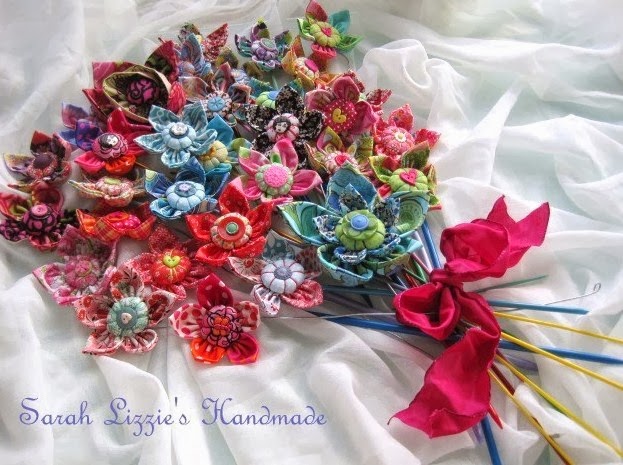 I have hot glued the fabric flowers to both knitting needles and lengths of wire to make single stem flowers. The flowers look so pretty bunched in overspilling bouquets of floral extravagance!