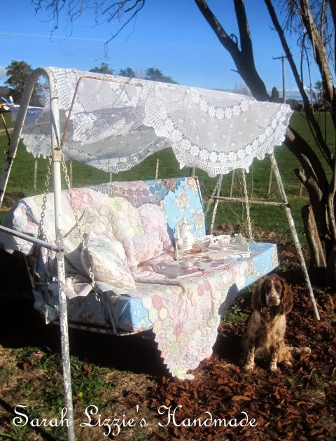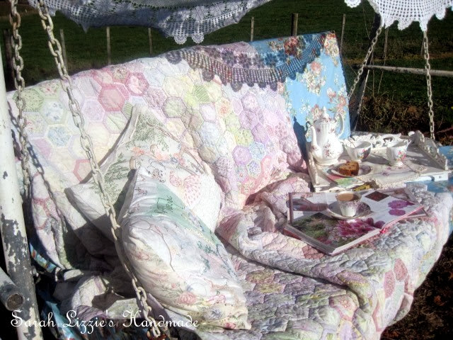 Such a brilliant idea to fasten the flowers to old knitting needles. They are gorgeous! Whatever Miss Maize is planting, seems to be agreeing with your garden. It is simply divine. To sit on that swing ( although I'd get motion sickness) and study that quilt with a cup of tea, would be the perfect afternoon.