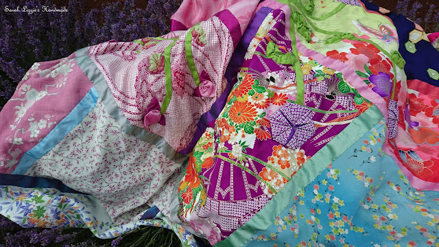 When the idea of a quilt fashioned out of Japanese kimono fabrics with origami flowers thrown into the mix, began to formulate in my brain pan, I confess I did wonder what was I thinking. My daughter had gifted me some of these beautiful Japanese silks so I decided I wanted to fashion a quilt showcasing these amazing designs. When 'we' first arrived in Tassie, I happened upon a stall at my favourite markets, where a lady sold Japanese fabrics that she had cut from vintage kimonos. I purchased quite a few and added them to the mix. A match made in heaven if you ask me.
