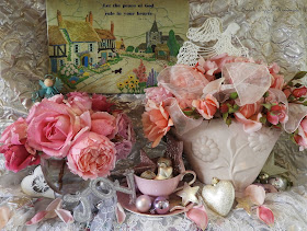 How are you all?? Excited?? Exhausted?? Pensive?? Sorrowful?? Joyful?? Eager with anticipation?? Why, if I was to step onto that porch of yours and peek through your decorated windows, what would I see?? Perhaps some of you, with a vintage apron wrapped around your waist, busily preparing gastronomical delights.....gingerbread houses...cookies decorated as santas, reindeer or other such concoctions. Others of you perhaps dressing the turkey and mixing ingredients for the Christmas cake?? Perhaps some of you have collapsed exhausted onto the sofa under the branches of the twinkling Christmas tree?? I can see some of you buried under pretty paper and ribbons and trims, carefully wrapping presents. Oh, all the pretty paper.....I must say, so beautiful! Oh.....and then there are some of you who are busily stitching the very last stitches onto that last beautiful handmade gift. Aah....Christmas, the season quite like no other.