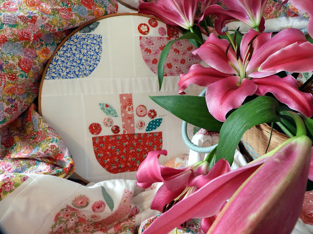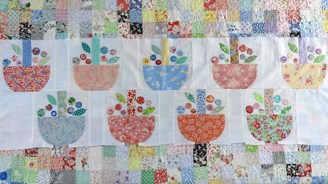 More tiny circles of pretty fabric have been coaxed into flower buds and appliqued onto the baskets. I must say these little buds and leaves are the easiest to applique.....much easier than the flowers on my flower garden quilt.