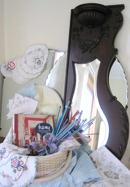 And what treasures they are.......well at least they are to me. I added to my 'dowry of cloth' (I am always in need of an embroidered pretty or two or three.......). I found an old sewing basket which is a little worse for wear, but not to worry, with a little fixer-uppering by li'l olde me it will be as good as new. I also added to my coloured knitting needle collection......I have been making fabric flowers of late and they make beautiful flower stems, besides they look ever so colourful bunched en masse in a glass receptacle. And....of course....I couldn't let the day pass by without buying a book. The book in question is called 'Home' and if I ever get a free moment, I might just sit in front of the fire, and take an armchair voyeuristic journey into the homes of the 50 famous people's interiors.