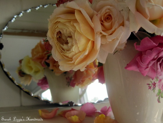 Hello all you lovely lovelies♥ 'Tis Sunday again. The day when I take it a little easier....the day of rest (well it is at least for me)..... the day for a little slow hand stitching. This week I have been enjoying a li'l bit of happy stitching. More fabric baskets and handles, which I chatted about here, have been stitched together. More playing with bright and happy reproduction prints.....and of course more playing with flowers cut from the garden.