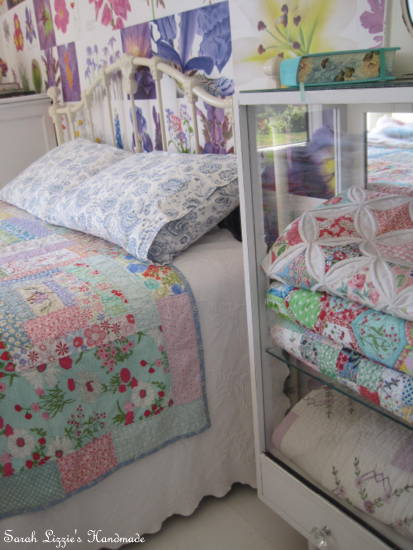 From very early morning, Old Man Sun trickles his rays into the bedroom like a warming caress, and as the momentum of the day journeys on, engulfing this most delightful room with bright and happy sunshine. Although his beaming smile is always welcome, the sunshine does perish the quilts that rest on the bed. The hexie quilt that I fashioned years ago has perished a little and requires a little tender loving care to repair it. Therefore, I change the quilts often.....hence the reason why a smattering of quilts rest in the pretty cupboard beside the bed, and even more reason to stitch some more pretty quilts. The Cathedral quilt is my next "to do" pretty. Hopefully it will be singing a hallelujah chorus, resting ever so prettily on my bed, before my pretty scrappy quilt fades into anonymity. :)