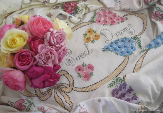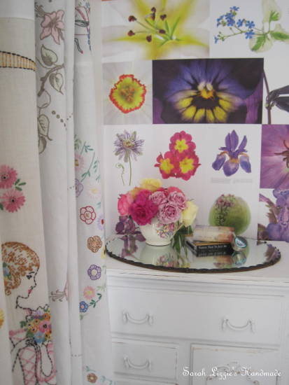 I love the finished curtain at the window. I can hear your thoughts ticking away......but what about your husband.....does he mind having all these lovely linens draping the window?? Believe it or not, he loves it. The southern belle smiling at him rather serenely doesn't seem to bother him at all. =) Besides, because the curtain is made of vintage linens with mostly backgrounds of cream or white with embroidered flowers here and there, it creates a lovely calming ambience. Also, as the curtain is pulled right back during the day, it disappears into a blur of pretty pattern.