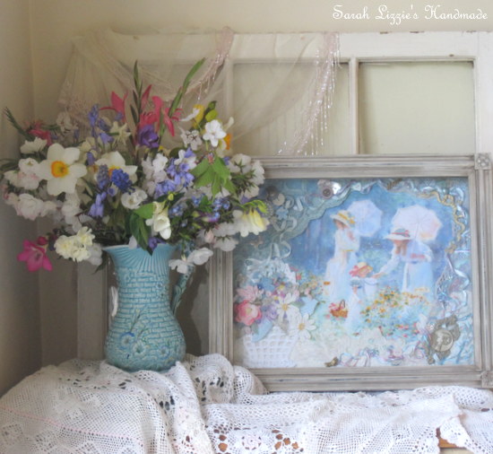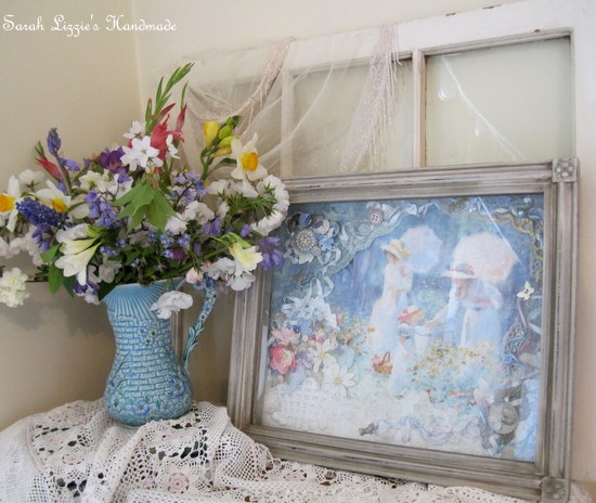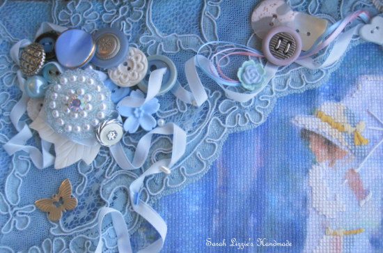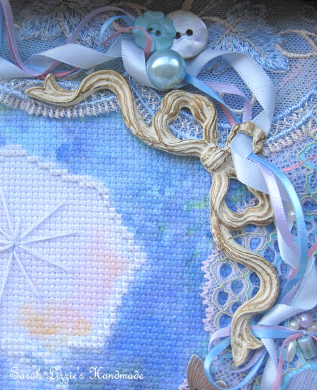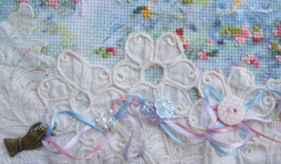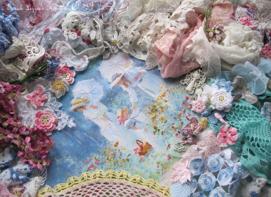 I gathered together various visually pleasing French and vintage laces, carefully stitching them around the border of the canvas.