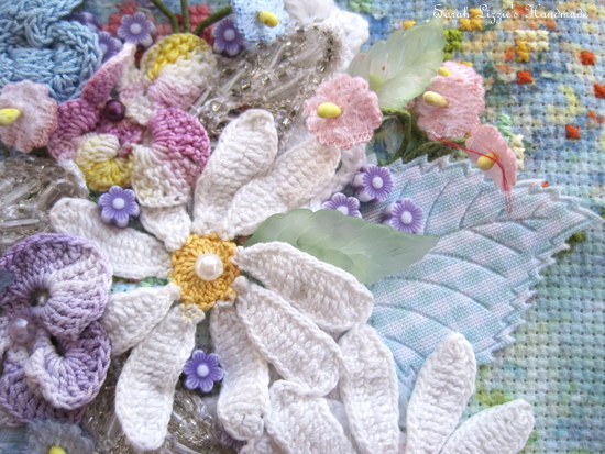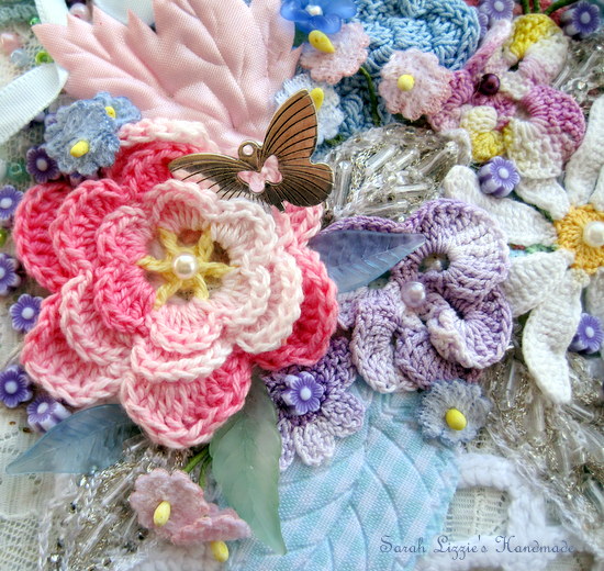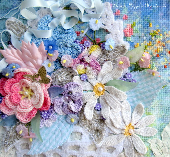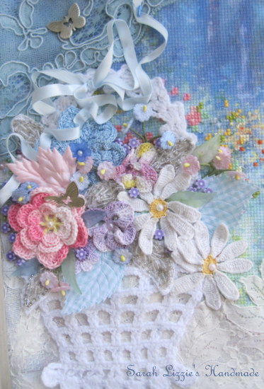I espied a crochet basket of flowers hiding in my plethora of pretties. I stitched it to the canvas, filling it with a beauteous, floral arrangement using a melange of crochet flowers that I snippety snipped from doilies. I added various leaves, fluttering butterflies and tiny silk flowers to fill in the gaps.  I do find the prettiest things in my lace and doily stash!!