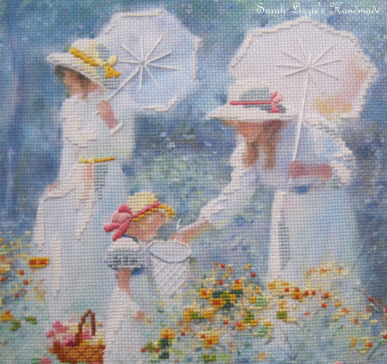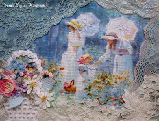 There are two young ladies of a bygone era, dressed in pretty lace trimmed dresses, carrying  parasols; and a little girl standing in a meadow of dainty flowers. This pretty really is exquisite.