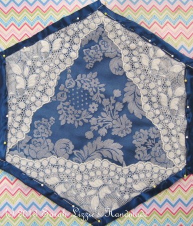 Place the top fabric hexagon on top of the batting and then place the lace or doily on top of the fabric. I suppose I should point out that you place the fabric with the straight grain on the batting.........but sometimes I break this rule. 'Tis very naughty of me, I know.....but I did warn you that I sometimes break the sewing tenets! Pin rather extensively as the fabric and the lace need to be flat. You could of course spray quilting adhesive on the batting and then place the fabric on top instead of using pins...this would make the hexagon completely flat and easier to sew. Zig zag (serge) around the edge of the hexagon. Trim and neaten excess fabric/lace.