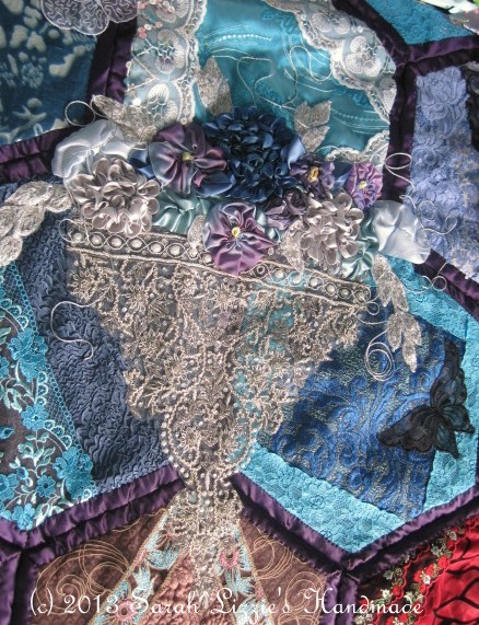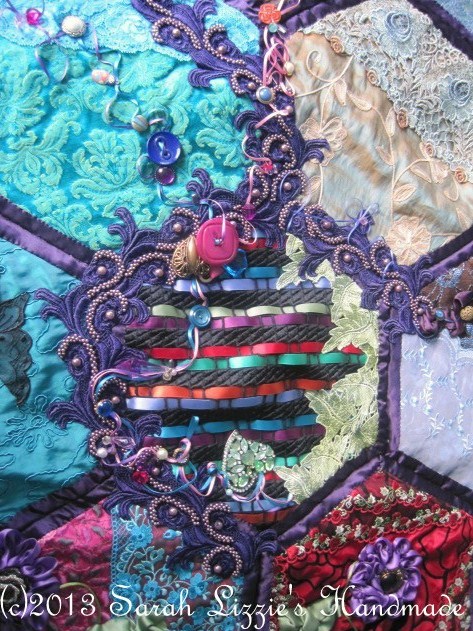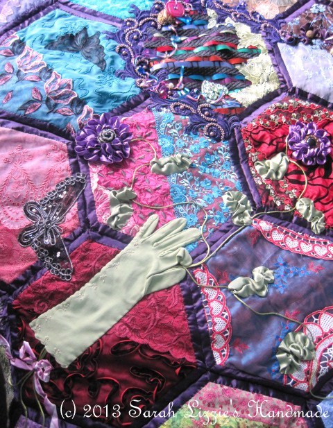 The beauty of this quilt is that you can take each individual hexagon with you wherever you go and work on it and as each hexagon is finished, you sew them together until it grows to the required size. Then, when the quilt is all together you embellish it as little or as much as you desire or, perish the thought, you may not want to embellish your quilt at all. Me being me, whose philosophy is 'more is never enough' and who has a soft spot for those gorgeous crazy quilts of yesteryear; I rather go to town with the embellishing stage!