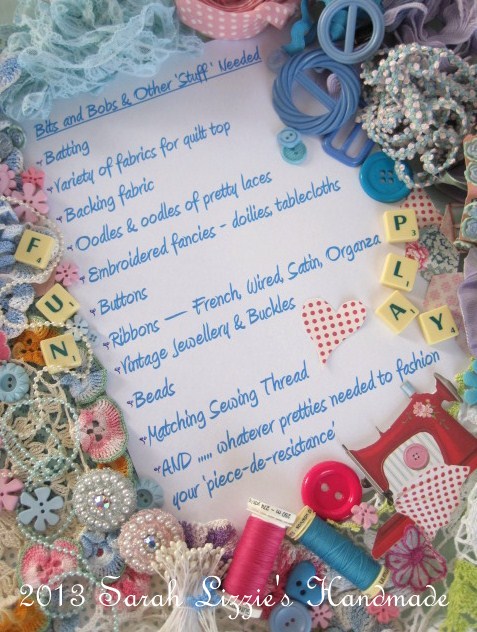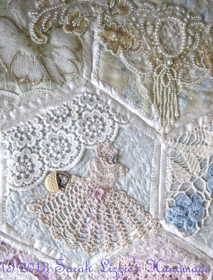 'quilt-as-you-go' hexagon quilt a wee bit tedious. All that cutting......hexagon after hexagon......the batting, the backing and the top fabric.......plus the myriad of laces required to prettify my quilt, are required at the start. But all that ho-hum preparation in the beginning is well worth it when you get to the fun part....the part when you embellish and needless to say; the end, where with the final stitch stitched, you have in your pin-pricked and calloused fingers, one very original and spectacularly sumptuous, embellished hexagon quilt.....quite unlike any other that has gone before!!