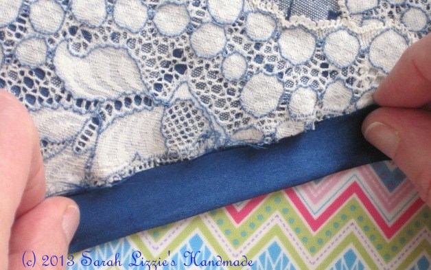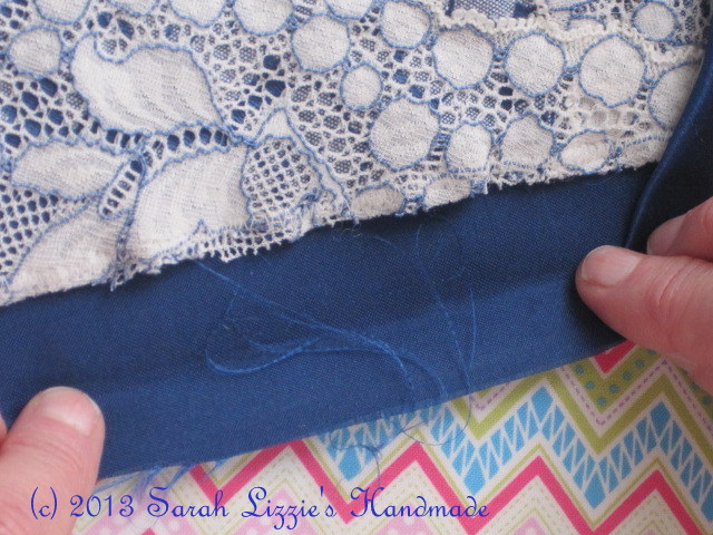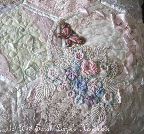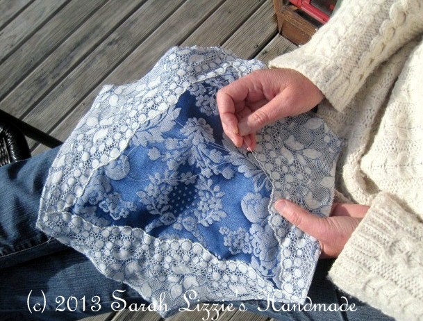 At this point hand stitch tiny invisible stitches randomly all over to secure lace/fabric to the batting.