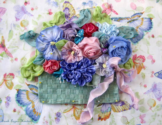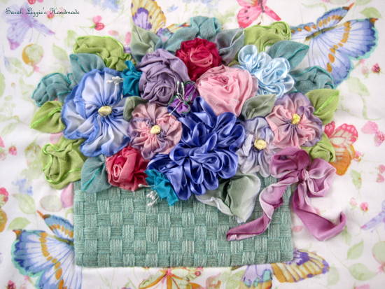 Sitting in my sewing room, with the morning sunshine radiating warmth and contentment I happily coaxed pretty ribbons into flowers stitching as I went, cinching each flower here and there. For the basket I weaved raffia-type ribbon in and out. This ribbon really adds the texture and feel of a bone fide basket.