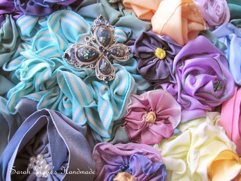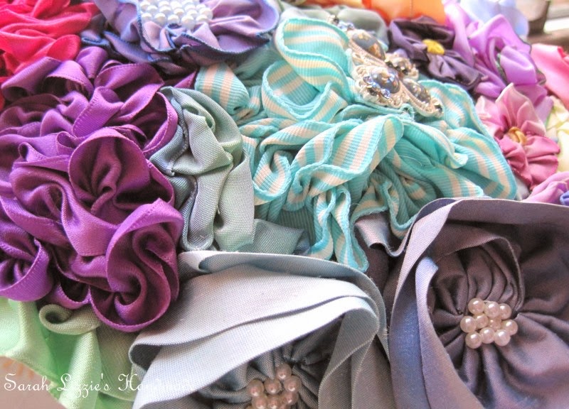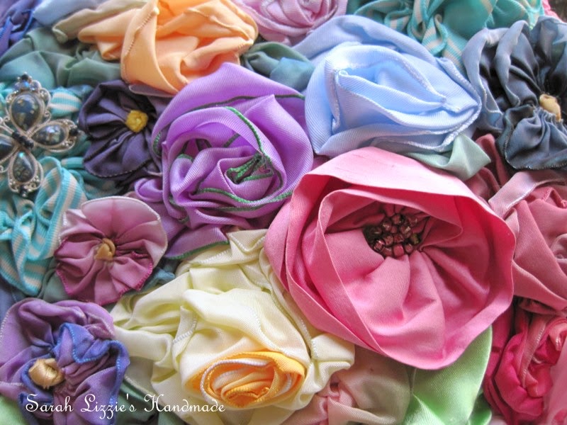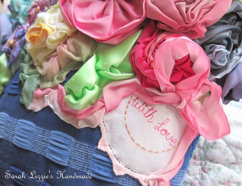 It's safe to say that I love ribbons. Indeed, my sewing room houses many a hat box and many a suitcase filled with a plethora of gorgeous, frilly ribbons. I seem to be forever fashioning oodles and oodles of flowers out of an abundance of pretty ribbons as embellishments; adding them to whatever it is that I am stitching at any given time......quilts, bags, cushions, a hat, a jacket, et cetera. So often a project is begging to have a cabbage rose, a pansy, a ballerina-like fuchsia or some other floral pretty to add a little pizazz, a little bit of oomph to it!