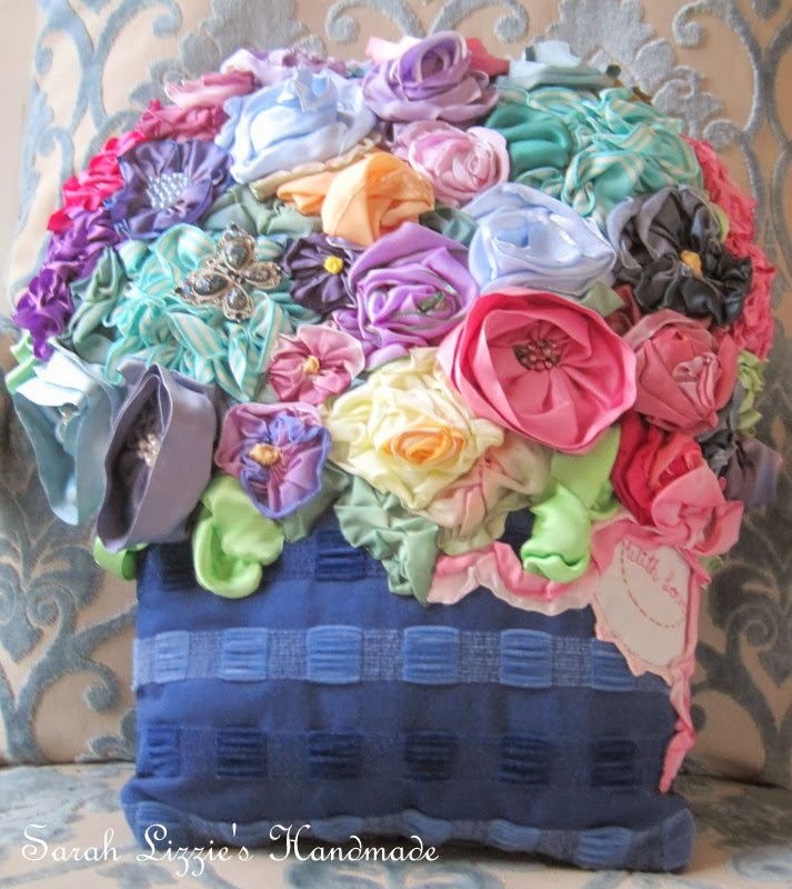 I fashioned masses of flowers and leaves; wired ribbon roses, pansies, ruched frilly zinnias and stitched them onto the cushion until they resembled a floral-filled bouquet of vibrant, dancing colour!