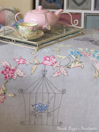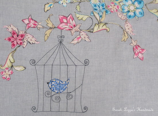 On two of the sides I thought I might machine sketch some sweet birdies in bird cages, hanging from the flowers.
