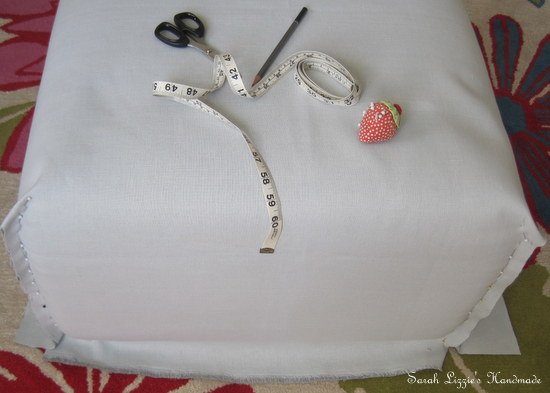 First things first. I draped the fabric over the pouffe with the right side of the fabric facing the right side of the pouffe. I chose a wide fabric so that I could do this without too much fussing around. Who wants to waste time fussing, when one's fingers are itching to commence the stitching magic! I pinned the four sides making sure it was a snug fit with a good size hem at the bottom.
