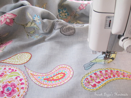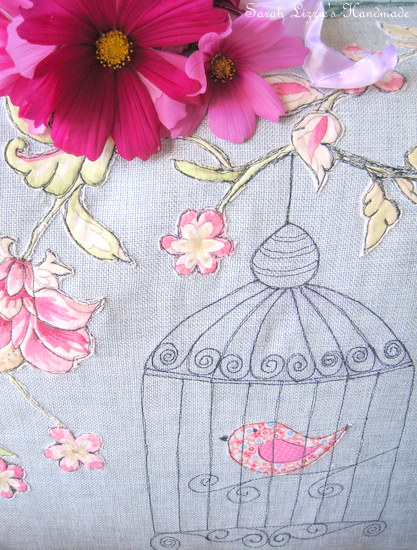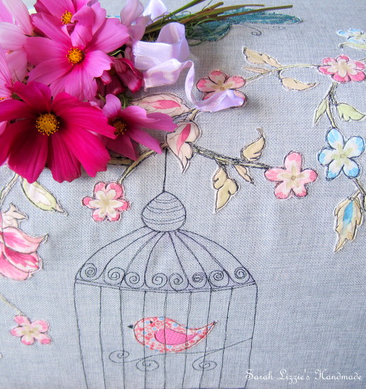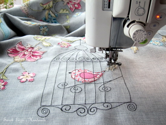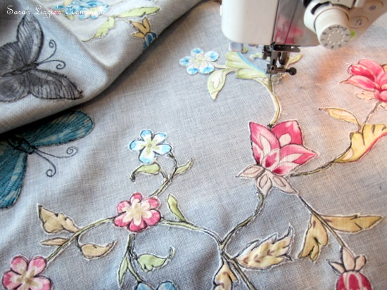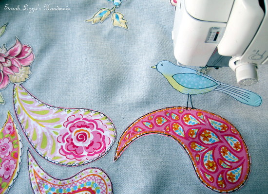 Turning the fabric right side out, now was the time to have a little fun. I ironed on vise-o-fix to the back of flowers and the other pretties and carefully snipped the flowers, butterflies, birds and whatever else founded their way onto the fabric, placing them in a meandering fashion across the fabric. When happy with my arrangement, the magic of machine sketching began.