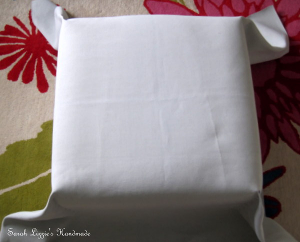 I affixed the cover to the pouffe, pulling it firmly for a snug fit, stapling the fabric to the underside of the  pouffe, all the way round.
