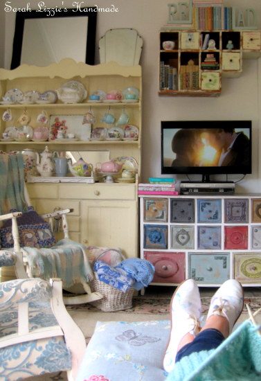 It must be time for this little Miss Muffet to rest her tippy toes on her gorgeous new tuffet and enjoy a little viewing of Miss Elizabeth Bennett and Mr Darcy......oh and of course knit some more of her pretty, aran jumper. I am afraid this woolly has been rather neglected this week. Perhaps some of that stitching magic can be transferred to a little knitting.