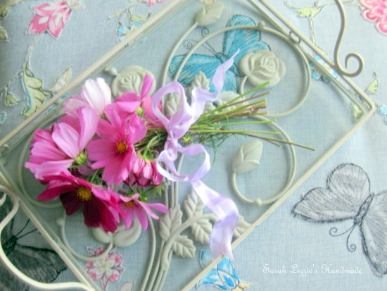 I drew a couple of Irises on paper, then pinned them onto the back, adding stems to add a little more interest.