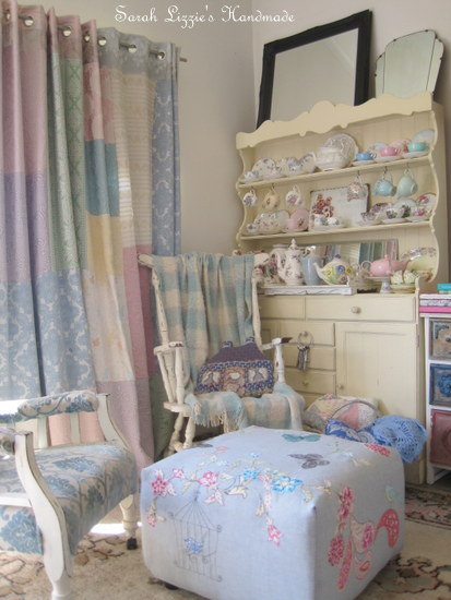 I am happy with my little slipper chair and it's pretty, new cover. So much easier on the eyes than the awful beige, faux velvet that it was draped in. Sometimes I like to sit on little chairs whilst I enjoy a little hand stitching or knitting. Being small my slipper chair doesn't take up as much visual or physical space, and I love the fact that being little it can be moved from room to room......the boudoir, my sewing room, even the family room; it will fit in perfectly wherever it sits. AND.....I can now sit low to the floor and put on my shoes!!