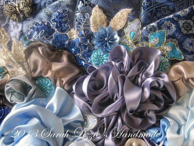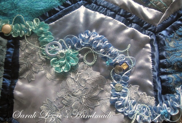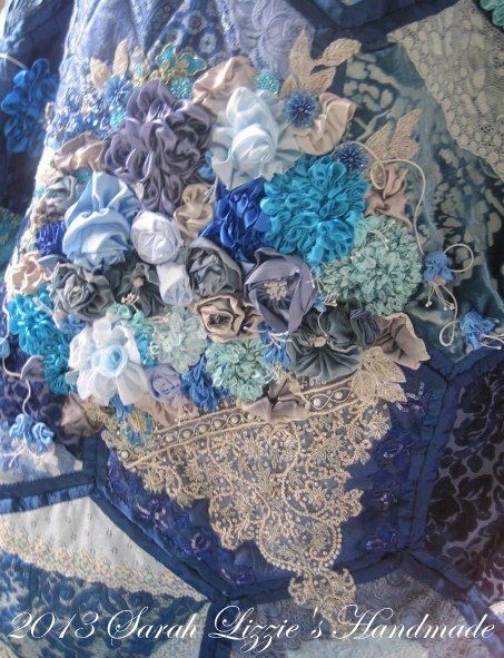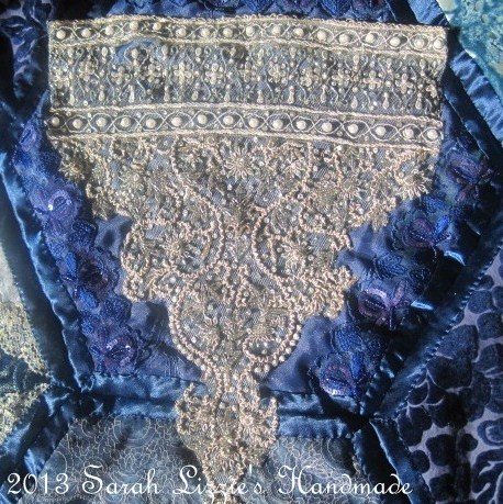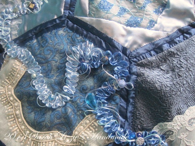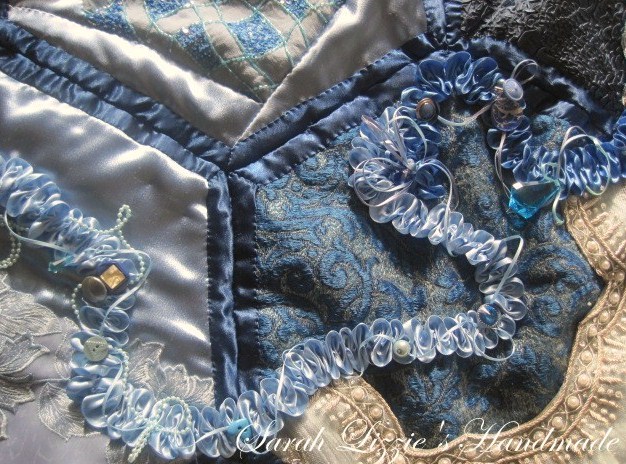 And to finish the embellishing, swirls and swirls of ruched ribbon, buttons, buckles, beads and a few pieces of vintage ornamentation meandering it's way across Little Miss Blue.