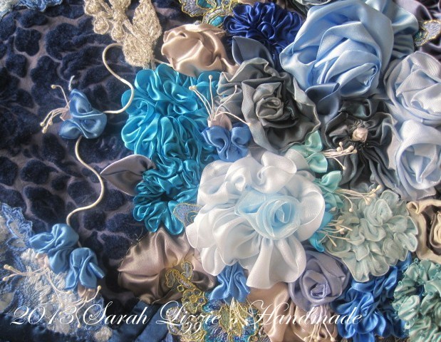 So....after ruching length after length of ribbon into zinnia-like flowers, folding and stitching french wired ribbon into blousey roses, stitching dancing ballerina-like fuchsias,  manipulating ribbon into pansies and fashioning ribbon into 'boat' leaves; with the addition of the odd smidgen of French lace here and there; I then stitched these efflorescent blooms where they now sit for evermore in the vintage 'vase'.