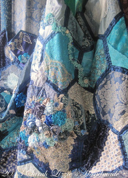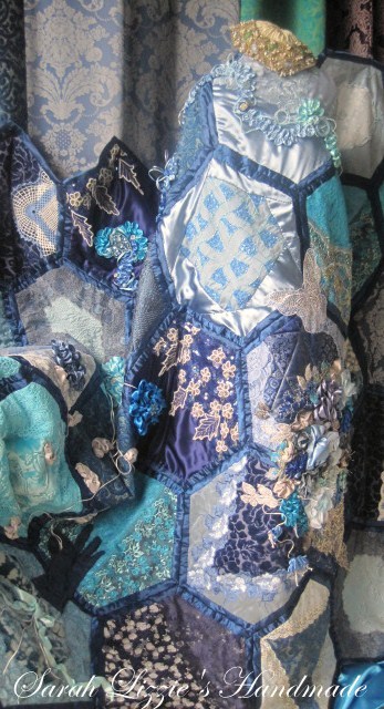 A blue-hued, embellished hexie which I hope will give many hours of delight to my very special friend Michelle!! Ours is a friendship of thousands of fibres connected to each other; threads which have lasted the gamut of life experiences....oft times hilarious, sometimes sad, shared interests, companionship, bottomless cups of tea AND always......Cadbury's chocolate!!