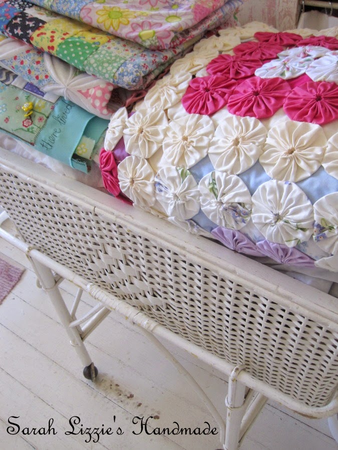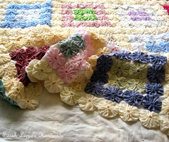 I have been working on this gorgeous yo-yo quilt that a lady asked me to finish for her grandmother. She wanted me to back it but of course that meant hand stitching it up and down the length of it, through the back, in the middl'e of each yo-yo. As this quilt is approx. 3 metres x 2.5 metres, it took a while.
