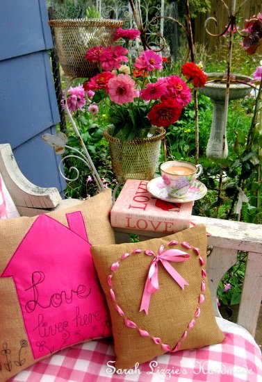 I cut out a simple shape of a house from some pink fabric, stitched it to the hessian and then stitched the words and flowers free hand. No drawings, no tracing, just free hand sketching. So, so easy; so, so quick; and so, so very pink!! But......that suits me perfectly fine as it goes perfectly with my bright pink front door!