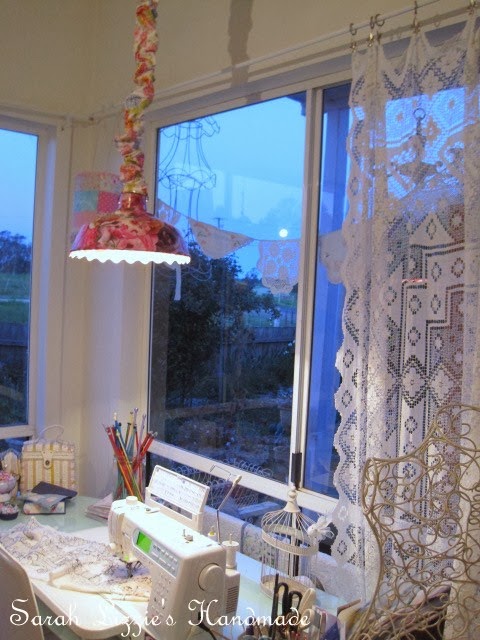 The entry window adorned with doily bunting and a sprinkling of spangles.