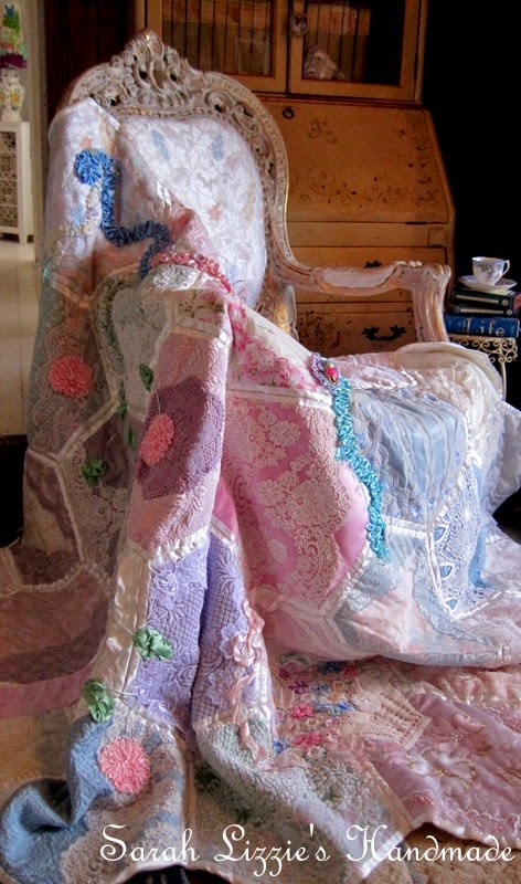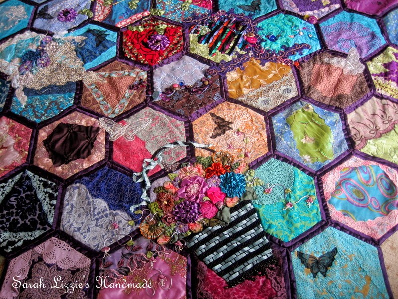 So I will have to stitch another HUGE hexie; but this one will be 'simple' with hardly any embellishments. Of course I will have to handcuff my hands so that they won't be tempted to add a li'l fancy button here and a li'l ribbon, floral pretty there......but I will be strong. I suppose, 'tis good news......just means this hexie will take less time to stitch.