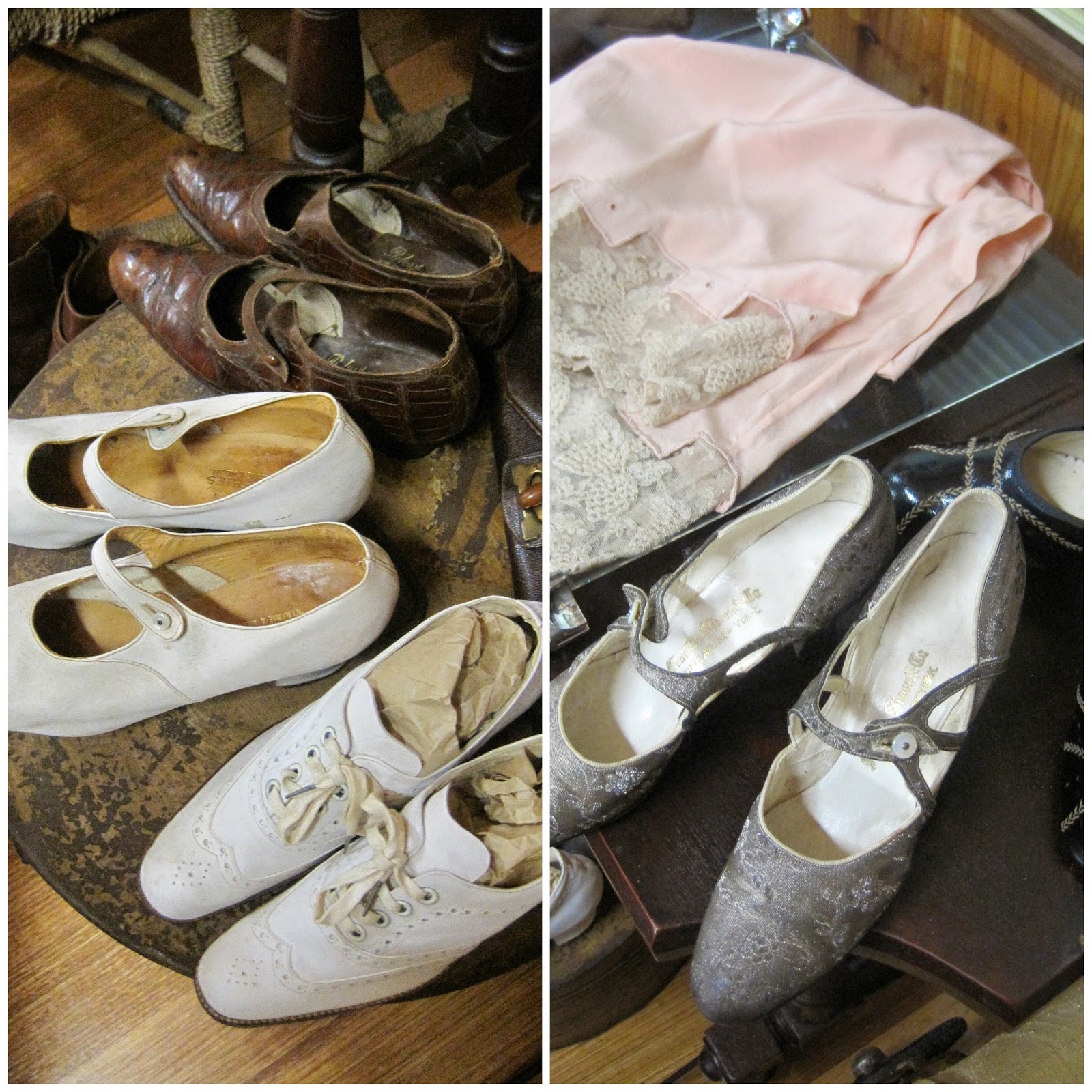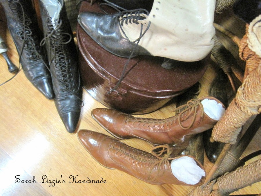 Ooh-la-la......pretty shoes. Why oh why did women have such small and dainty feet. I am supposing that in the good ole days, my clodhoppers would have had to get used to being barefoot. I simply cannot imagine squeezing my tootsies into these examples of footwear! My feet would have been a podiatrist's nightmare! I was informed that ladies of bygone eras squeezed into shoes a size or two smaller.....if you had small feet, then you were considered to be refined....quite the lady! Oh dear....don't like my chances of ever having been considered a lady!