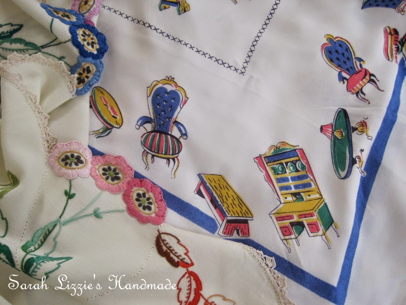 A pretty hand embroidered floral filled tablecloth and a whimsical 1960 printed tablecloth with a smattering of cute as cute furniture dancing around the tablecloth. I love this....not only to be used as a tablecloth, but there is oodles of fun inspiration to be had, as I design for the free hand drawing with my machine that I love to do. There is actually a fun project formulating in my brainpan as I 'chat', just looking at this fun tablecloth. That's the thing with inspiration.....it can be found everywhere, any moment of every day.