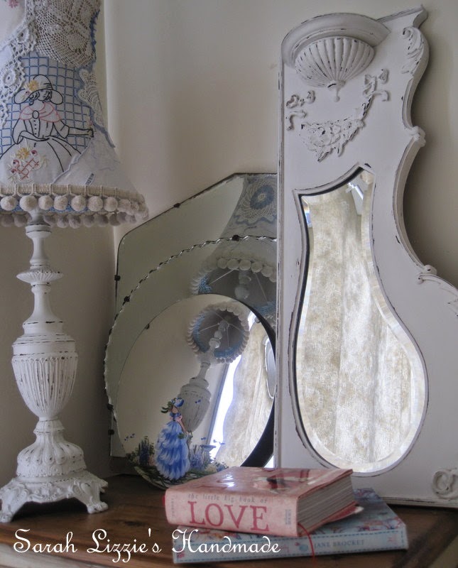 I found this pretty mirror. Though I have many looking glasses scattered throughout our li'l ole abode, I couldn't resist this one. As I have a penchant for Southern Belles, I just had to, had to take this li'l lass home with me. For now, she is keeping my other mirrors on my bedside table company.
