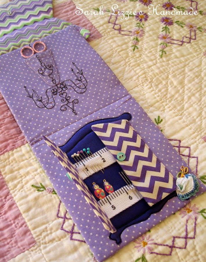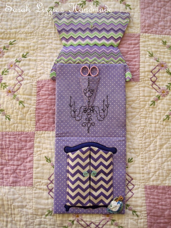 Now that my lovely armoire is finished, sitting ever so prettily  in front of the polka dot fabric-lined wall, making a design statement, I decided that there needed to be an "oh-so-elegant" candelabra hanging from the ceiling. This would be a wonderful way of housing the pretty embroidery scissors that I wanted to include. I stitched a little pocket for the scissors, then free hand stitched the top of the candelabra continuing to stitch the pattern downwards.