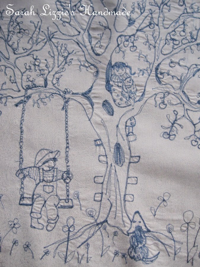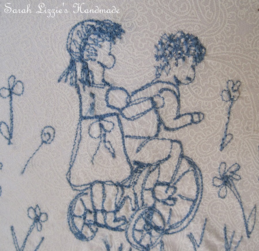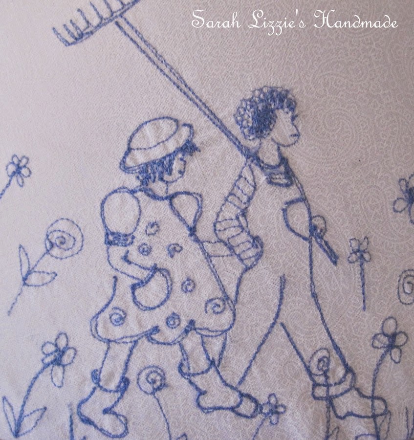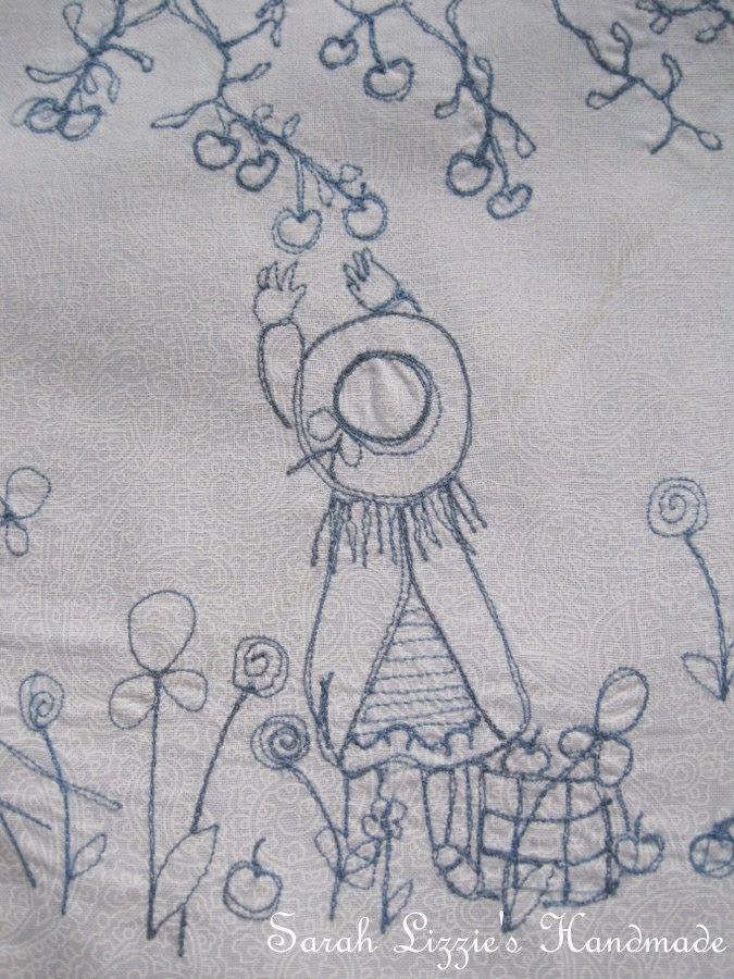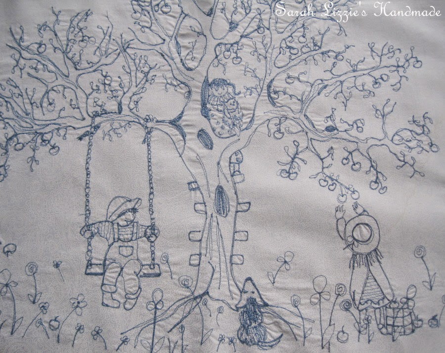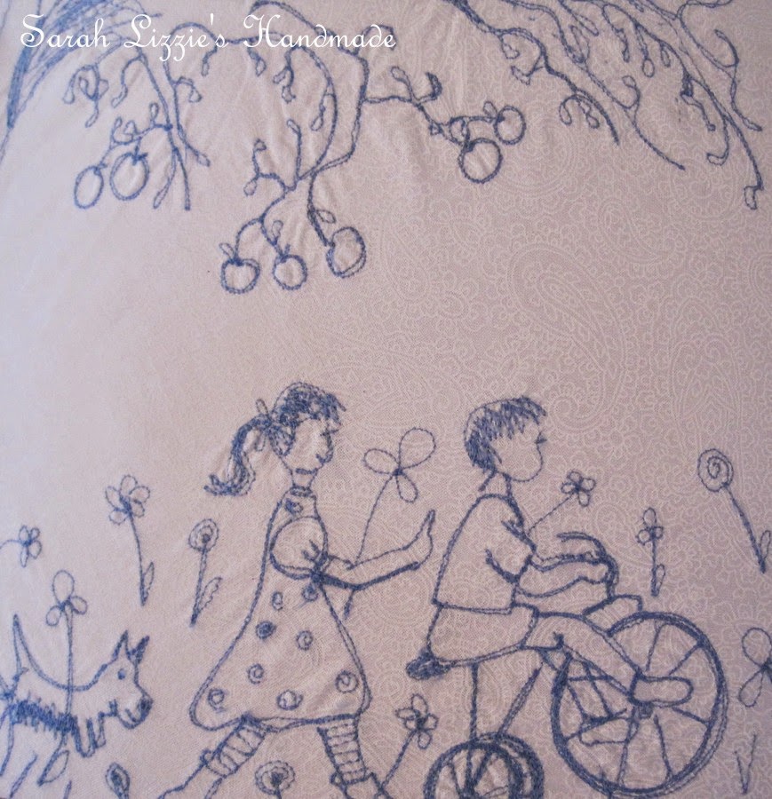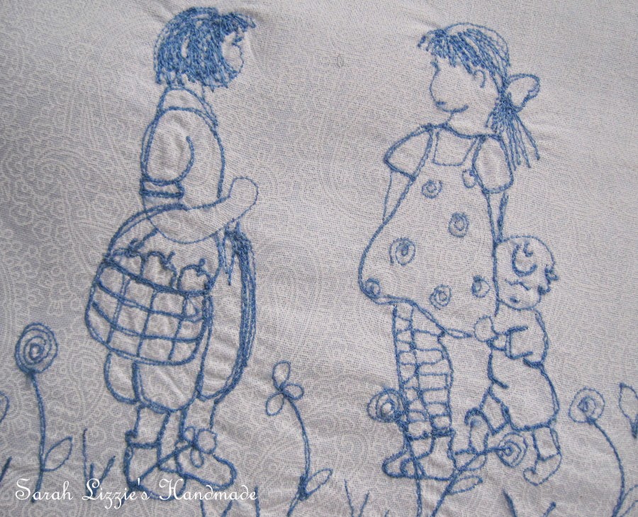 I decided that I wanted to stitch a tableau of cute children playing and strolling around a lampshade. Illustrations of cute children  picking apples from apple trees, children chatting, children swinging on swings, children climbing trees, children riding bikes....children laughing, chatting and having oodles of fun.