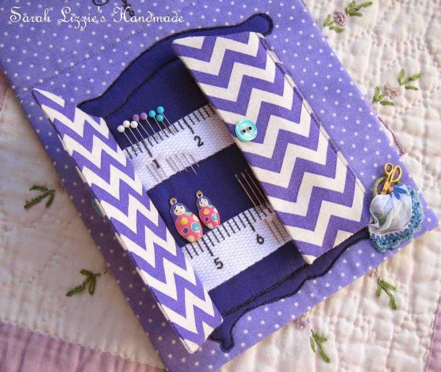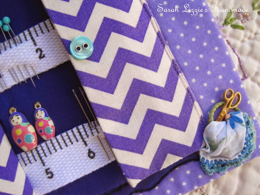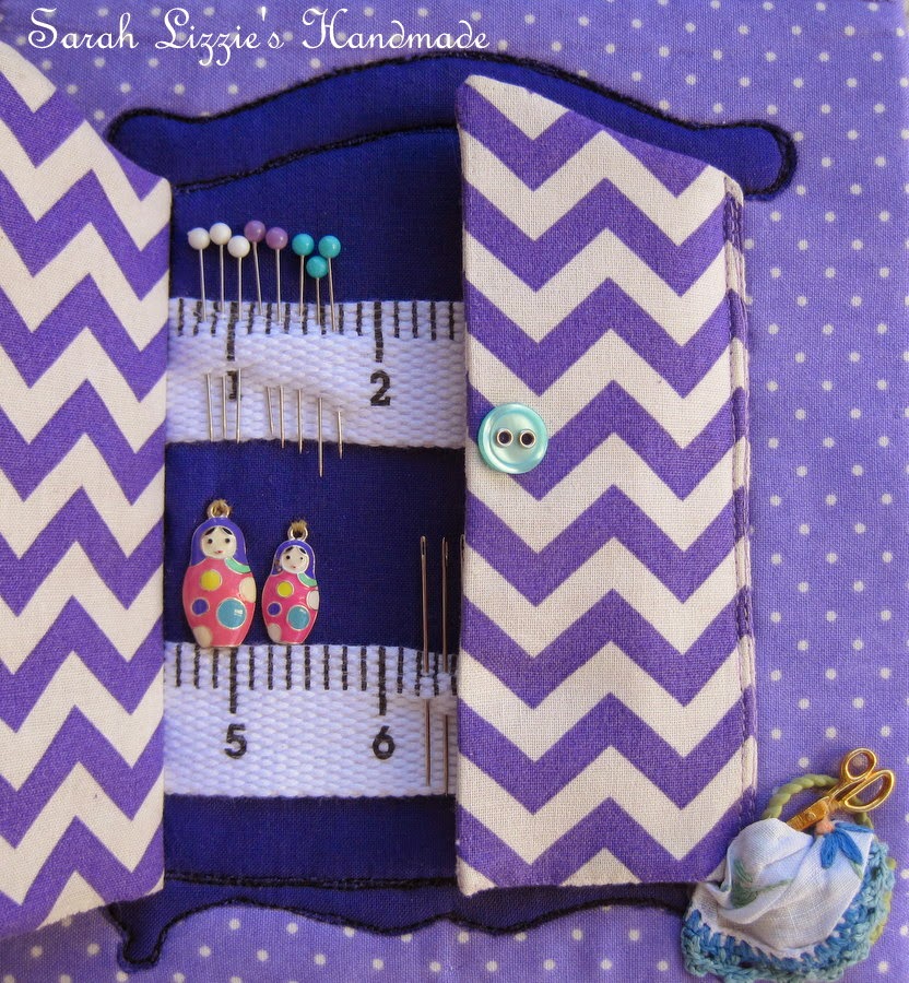 So......I drew an armoire, cut the fabric and free hand machine stitched it to the backing fabric with a small piece of batting in between. I then used a small length of 'measuring tape' cotton ribbon as the shelves. Every self respecting armoire needs a babushka doll or two and a lovely tea cup to sit alongside the sewing paraphernalia. I then sewed two doors, with buckram between both sides and stitched them to the armoire. I love the spiffy, state of the art, chevron doors, they are a perfect match with the purple fabric of the armoire....mmm....very in vogue!!