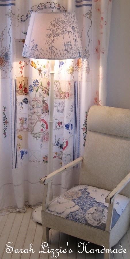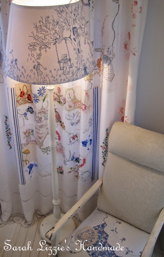 I carefully snipped scraps of fabric, pulling each panel of fabric as taut as I possibly could and stitched the seams together with a running stitch in embroidery cotton. I then added a  doily here and a doily there, carefully snipping around the doilies on the inside of the shade.