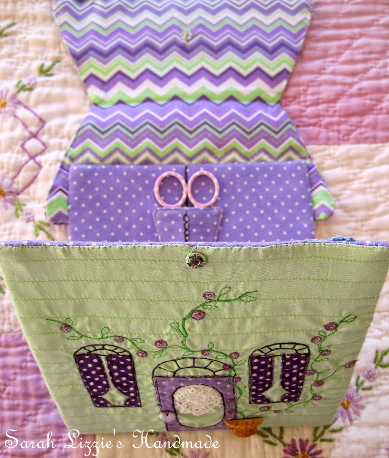 I really, really had the best fun designing and stitching this li'l needle book. I wanted to make something a li'l different; a 'Kim original'. So, now it's en route, over land and sea, wrapped in an embroidered pretty and tied with a pretty purple and green polka dot ribbon.
