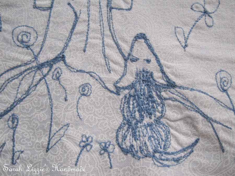 Now for  a really, really fun lampshade. Well it was fun for me....but then free hand machine stitching is something that really tickles my fancy. This style of stitching (which I have waxed lyrical about  previously and also here) satisfies my love to stitch by the seat of my pants. It satisfies my impetus to veer off that straight and narrow line of monotonous straight stitching, and explore the wiggly and crooked lines. I love the idea that I never really know what my machine sketching will turn out like, and though there is always a fog-like, grand plan demisting in my brainpan, nothing is ever set in needle and thread. If perchance there should be a li'l foible, a li'l hiccup, you just change the oddity into something else. There is something terribly lacking in my DNA as I get quite a kick out of making it up as I go. I love the sense of unexpectedness when drawing with my sewing machine. Of course this kinda stitching can be fraught with frustrations and annoyance along the way, but when all is finished I am usually tickled pink at the results before me and I know I have definitely learnt a thing or two along the way.