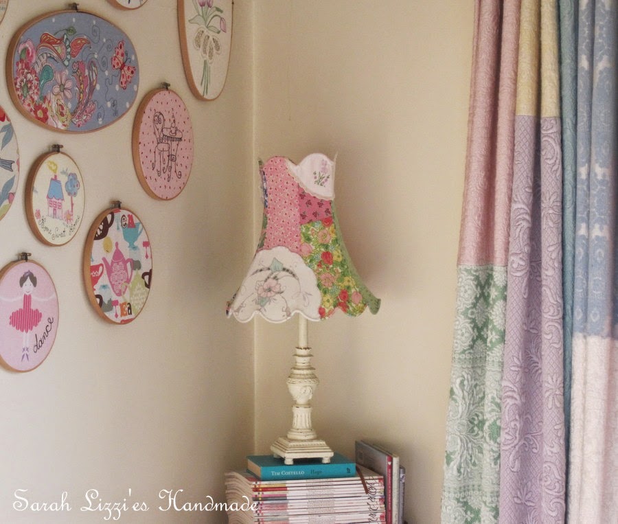 I carefully snipped scraps of fabric, pulling each panel of fabric as taut as I possibly could and stitched the seams together with a running stitch in embroidery cotton. I then added a  doily here and a doily there, carefully snipping around the doilies on the inside of the shade.