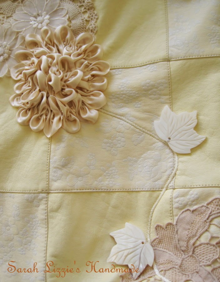 With my bag of the moment looking a li'l "how's your mother", I stitched a new one. I found this gorgeous soft as soft leatherette a while ago. It is cream with pretty white flowers and plain cream patchwork squares. Of course, I decided that the odd doily or two and a little ruched flower with some unique leaf buttons, would be required to add a li'l pizzaz to my bag.