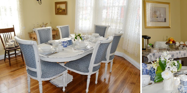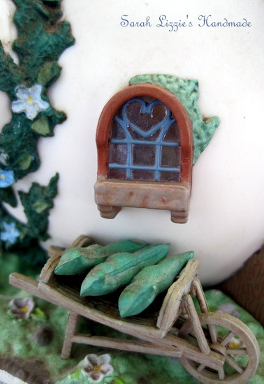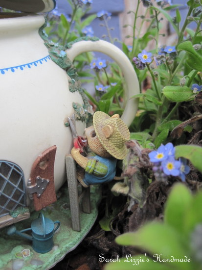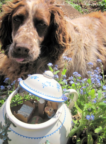 I tip-toed up the path and had a little peek as to whom the inhabitants of this quirky li'l teapot house could be. It was whitewashed with the prettiest blue trim. There was a Morning Glory vine winding it's way prettily around the walls. I must say the Morning Glories looked a dream among the Forget-me-nots on which the little teapot was sitting. The tiny, shuttered windows, which if one was to peek in, revealed the cosiest of interiors. There were cobblestone floors with beautiful rag rugs to keep tippy toes warm. A delectable meal was gurgling away on top of one of those enormous, fire-belching wood stoves. Indeed, the quaint kitchen did look to be the soul of this little home. A winding staircase climbed up to the attic where beds covered with pretty, patchwork quilts waited for weary workers at day's end. In my mind's eye I could visualise many a wee occupant having oodles of fun sliding down the bannister. There was a bendy chimney peeking from the spout, blissfully coughing up swirling spirals of smoke. Truly, this was the most magical of teapots.