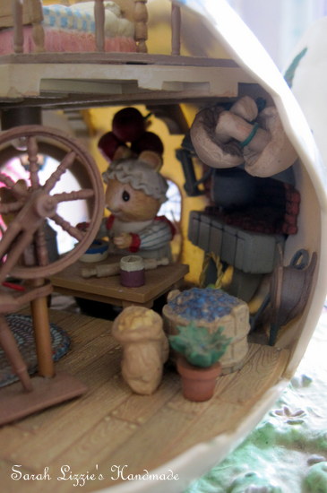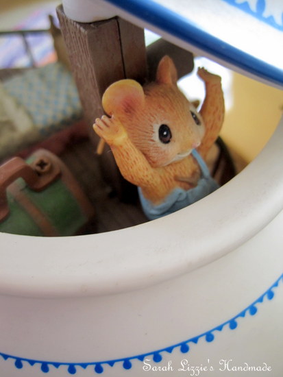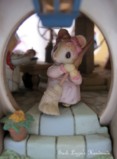 I could faintly hear the swish-swooshing of a broom and the sweet singing of "Oh what a beautiful morning" in the most mellifluous voice. To my amazement there was an itty bitty mouse dressed in a pretty frock with a pink bow tied around her tiny head.
