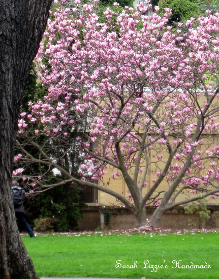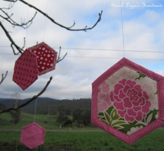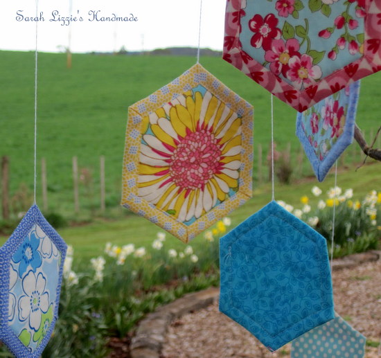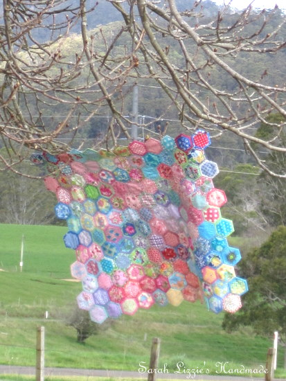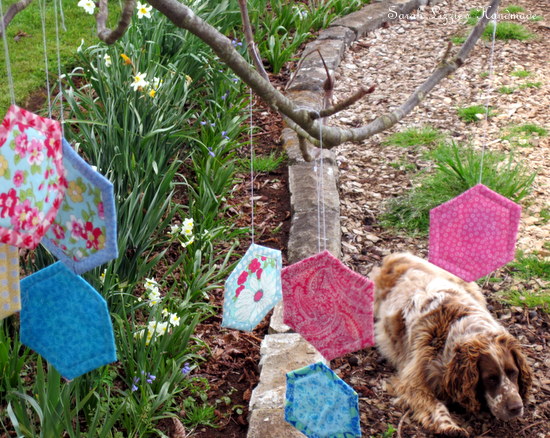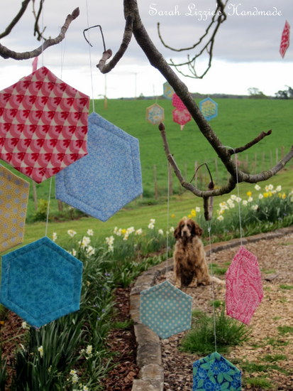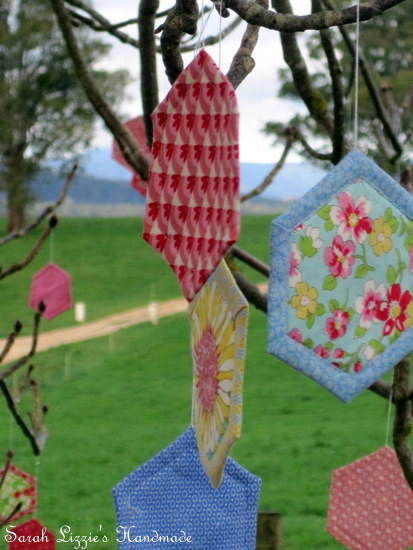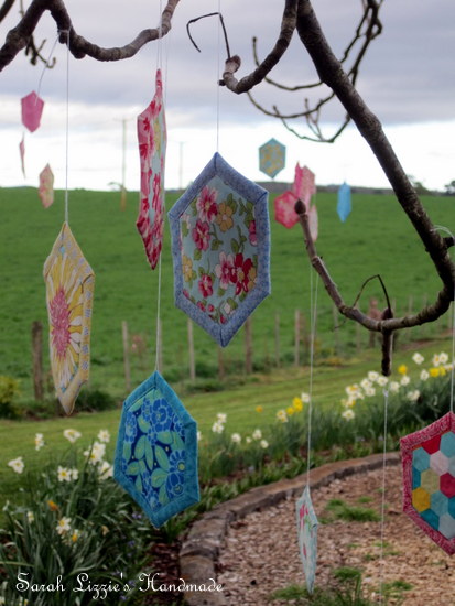 ....happening around the environs of our humble abode this week. Something terribly quizzical is afoot. The naked, wintry branches of the trees have begun to dress themselves with the prettiest of blossoms. Blossoms of fabric, resplendent in bejewelled colours and prints in the shape of a hexagon! How curious. I wonder, could this be a new cultivar of the hexagonus splendifora variety??