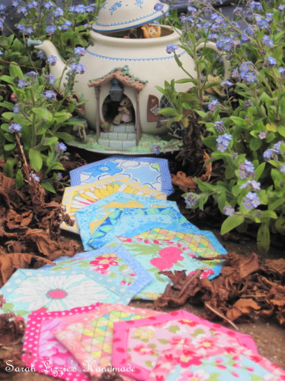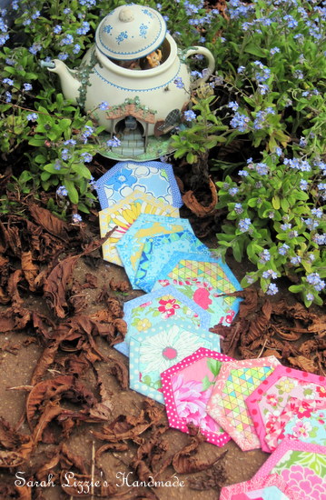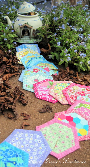 "To thank you for your hospitality in letting us stay a while in your beautiful garden, I would like to gift you some more hexagons. Doris tied them up with a pretty ribbon......she said you adore pretty ribbons. Besides, a gift is more the lovelier when cinched with a pretty bow, is it not? They should help make your quilt grow. When you need some more hexie delight, just pop by and I will make you a cup of tea that we can enjoy with a slice of Martha's pie."