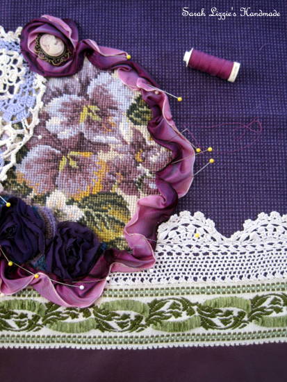 Now for the bags. One of my favourite things, as you already know, is to fashion bags using some of the pretties that I have collected over the years. I always relish diving head first into the bottom of my many holdalls, in search of the perfect piece of lace, the perfect vintage trinket, the perfect braid or fringing for each bag.